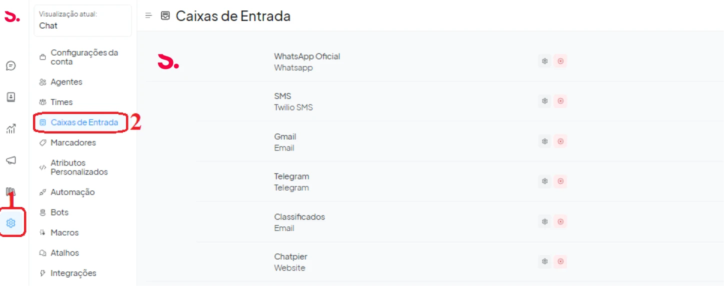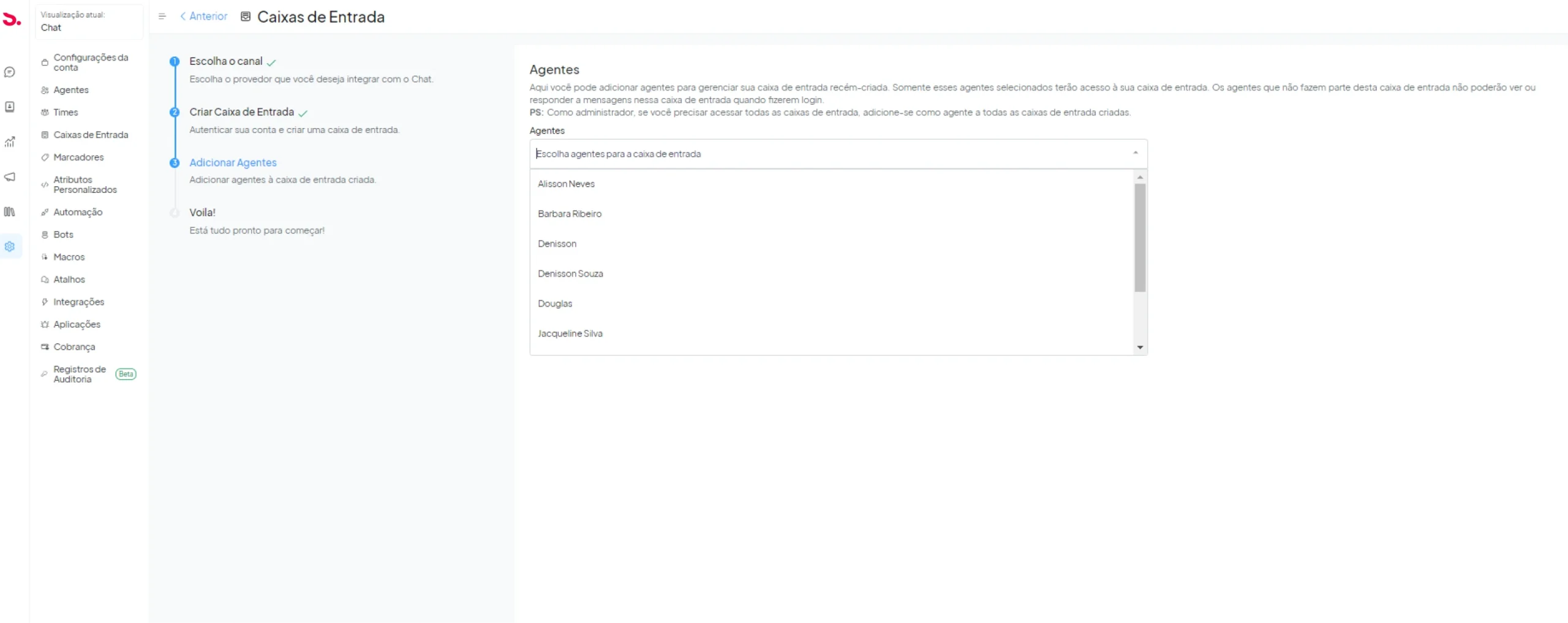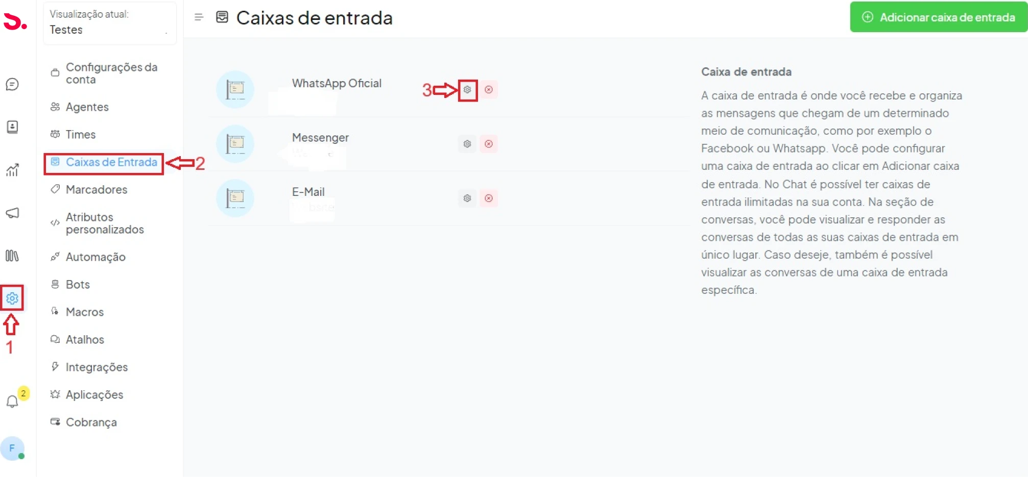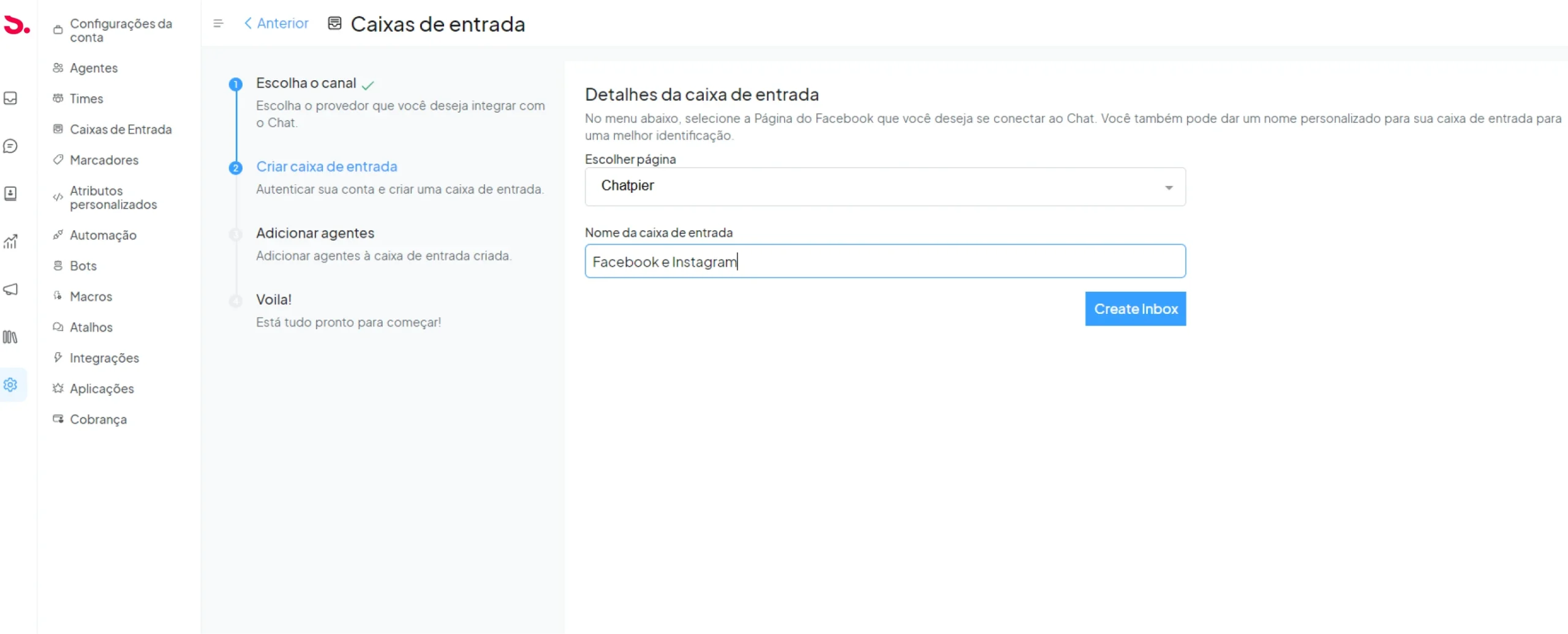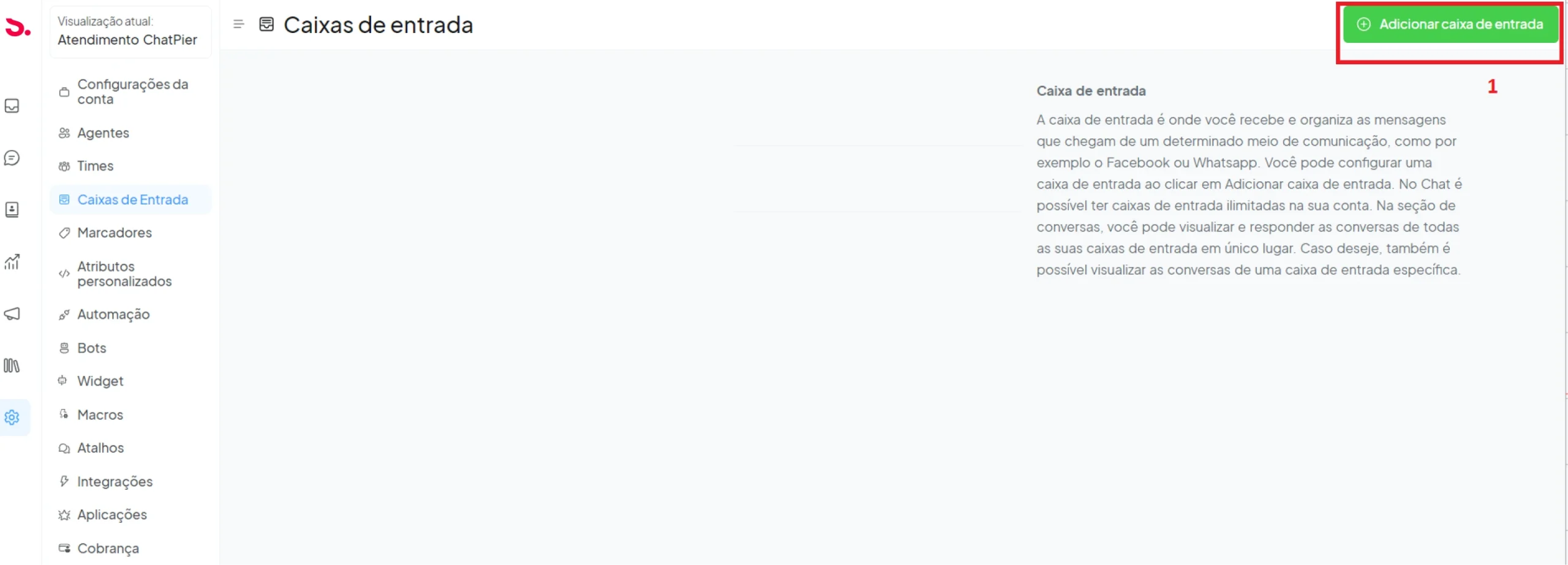 Adicionando caixas de entrada: A caixa de entrada é onde você recebe e organiza as mensagens que chegam de um determinado meio de comunicação, como, por exemplo, o Facebook ou Whatsapp. Você pode configurar uma caixa de entrada ao clicar em Adicionar caixa de entrada. No Chat é possível ter caixas de entrada ilimitadas na sua conta. Na seção de conversas, você pode visualizar e responder às conversas de todas as suas caixas de entrada em único lugar. Caso deseje, também é possível visualizar as conversas de uma caixa de entrada específica.