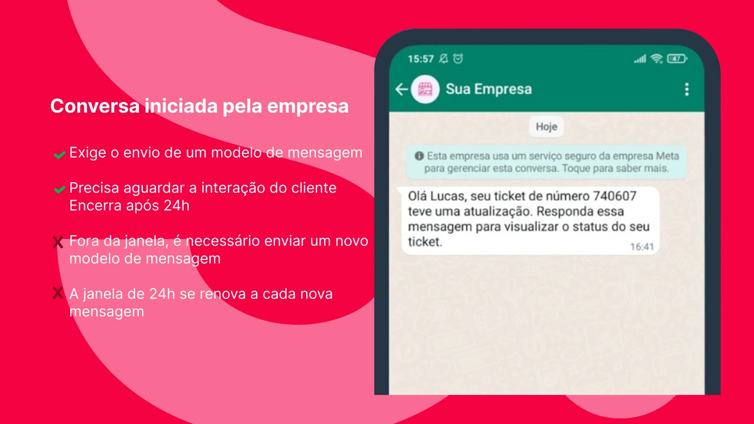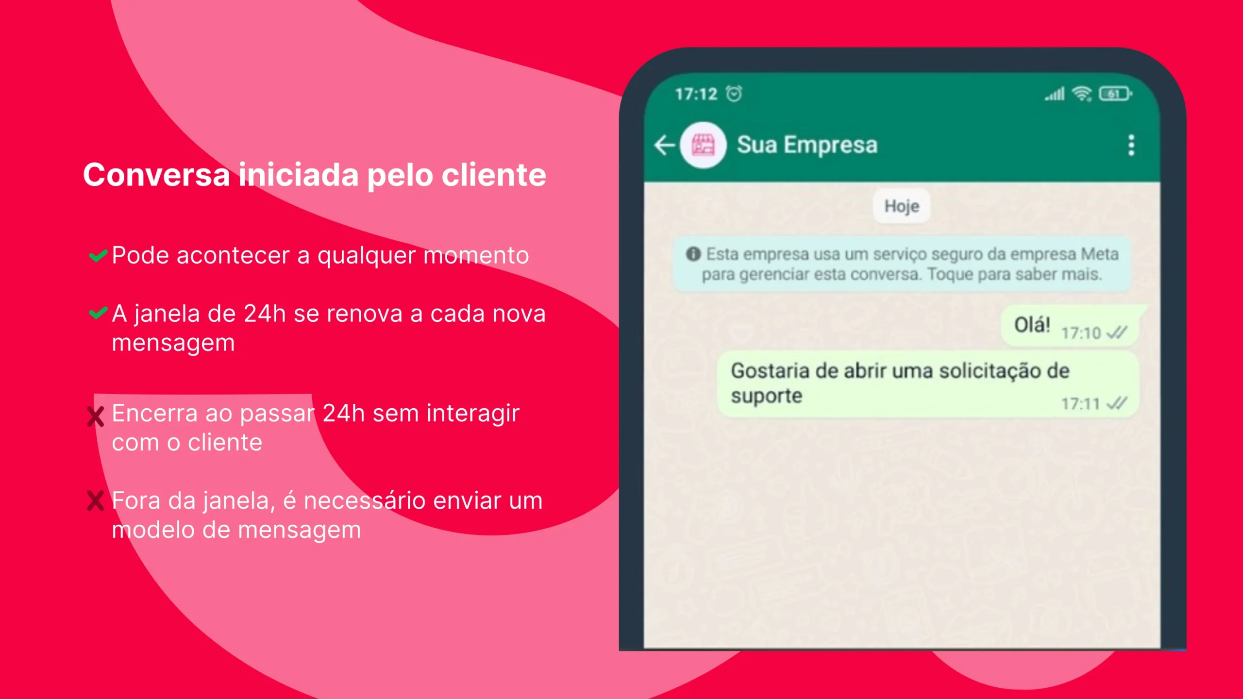 Uma janela é aberta sempre que o seu cliente envia uma nova mensagem para você. Quando isso acontece, o seu negócio tem a liberdade de conversar e prestar um bom atendimento.
