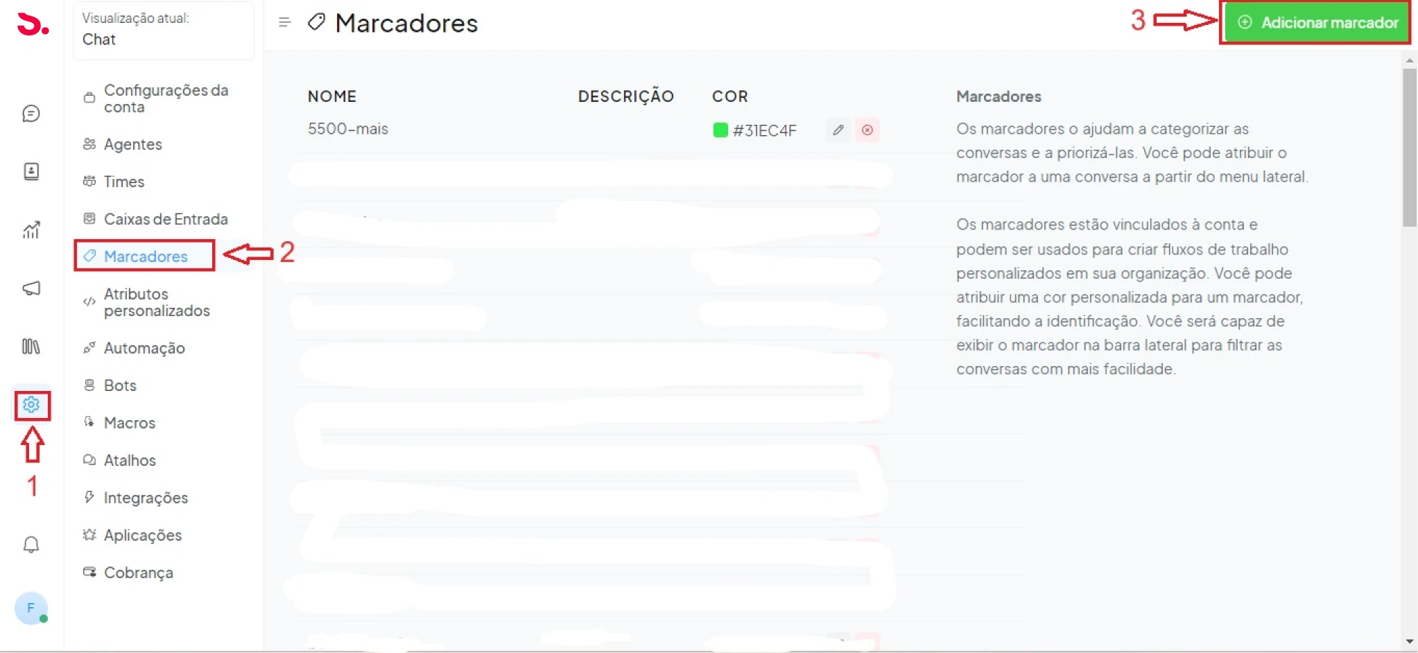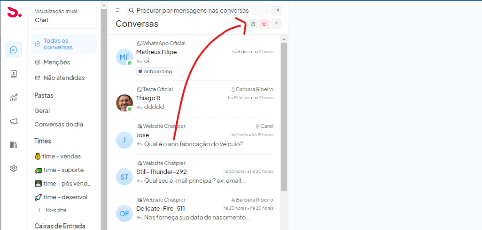 Filtros: Permitem filtrar conversas por status (abertas, resolvidas, pendentes), etiquetas, grupo atribuído, agente e canal de comunicação. Além disso, é possível salvar esses filtros para simplificar futuras pesquisas.