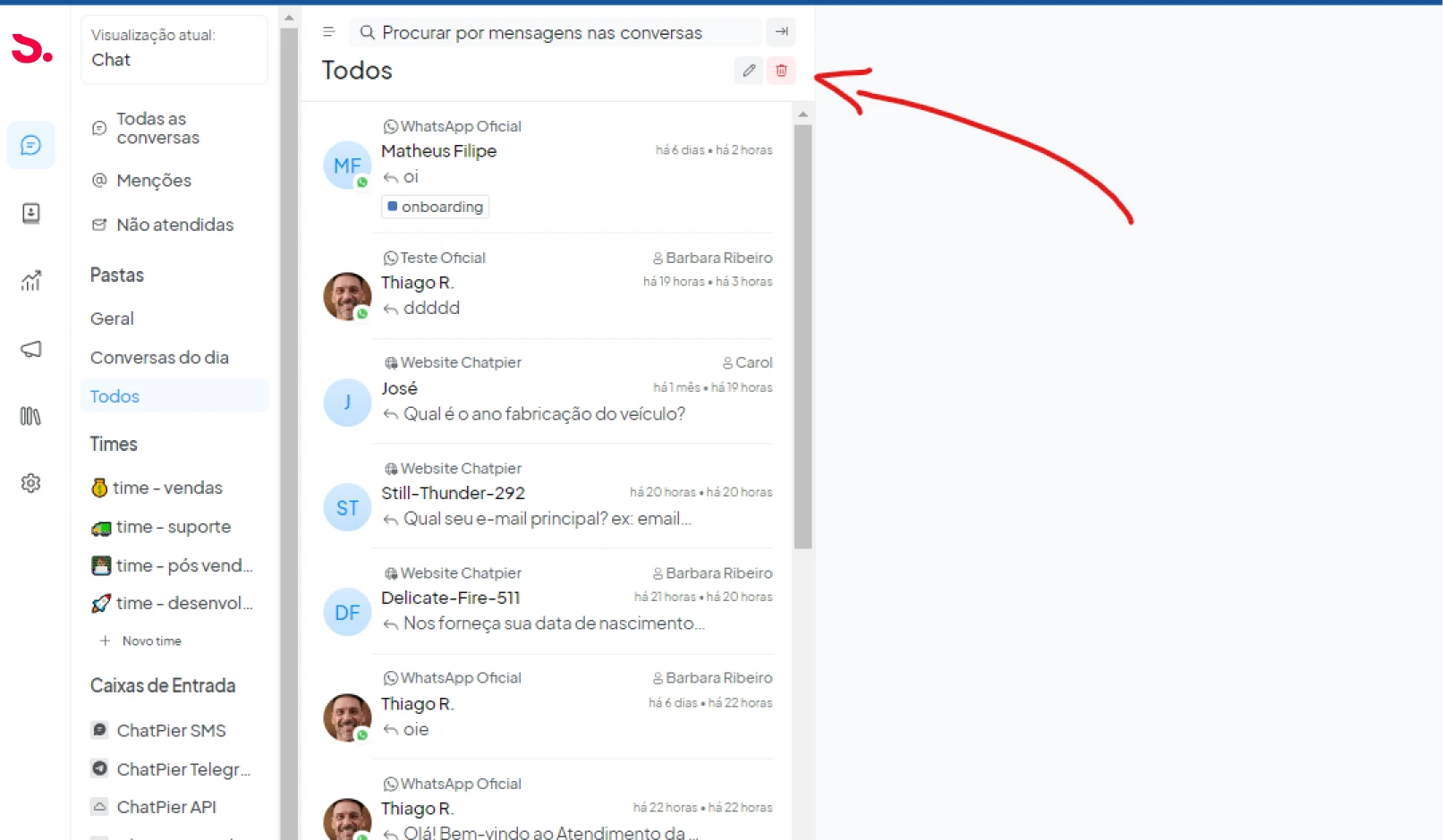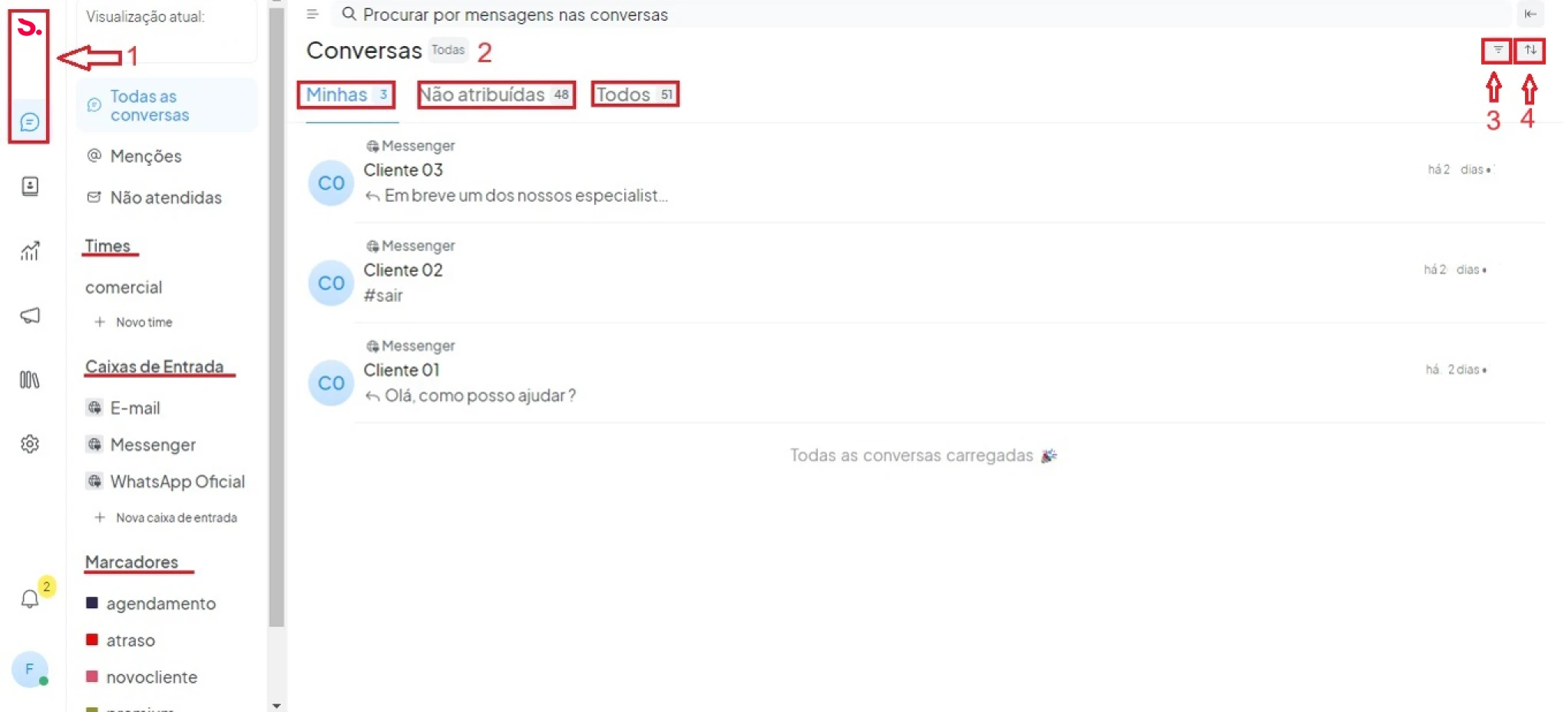 Etapa 2: As conversas estão listadas no painel esquerdo da tela. Você pode filtrar (3), buscar e classificar (4) as conversas.