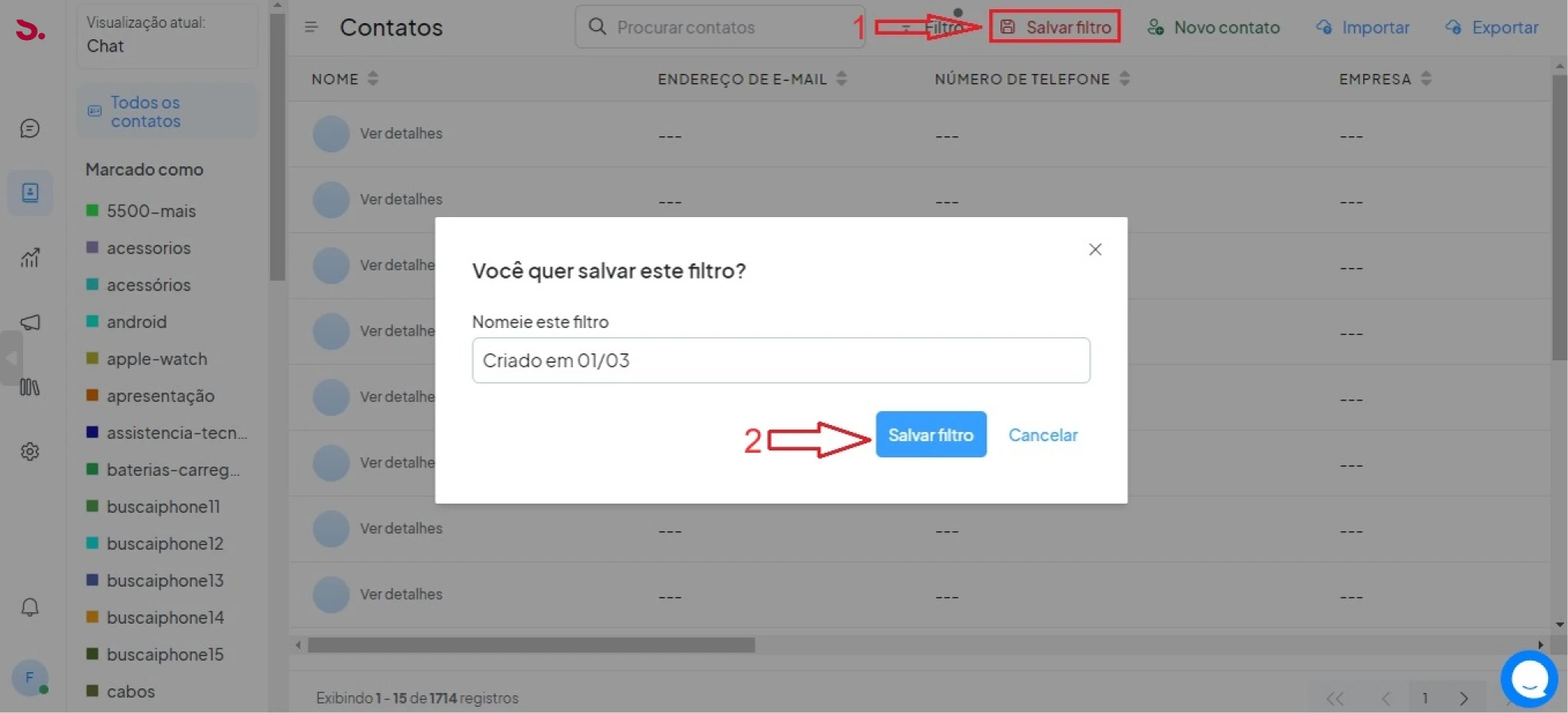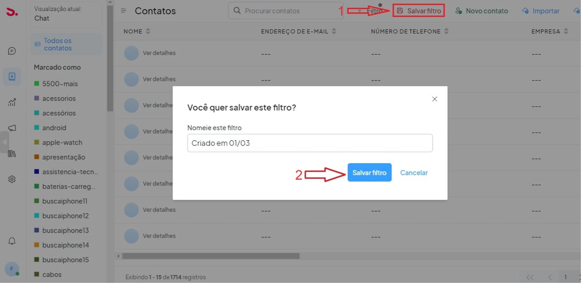 Após aplicar o filtro ele irá buscar todos os contatos com base nos valores fornecidos. E agora você pode ver o botão salvar filtro no cabeçalho da página de contato e clicar no botão salvar filtro, como na imagem anexada abaixo.