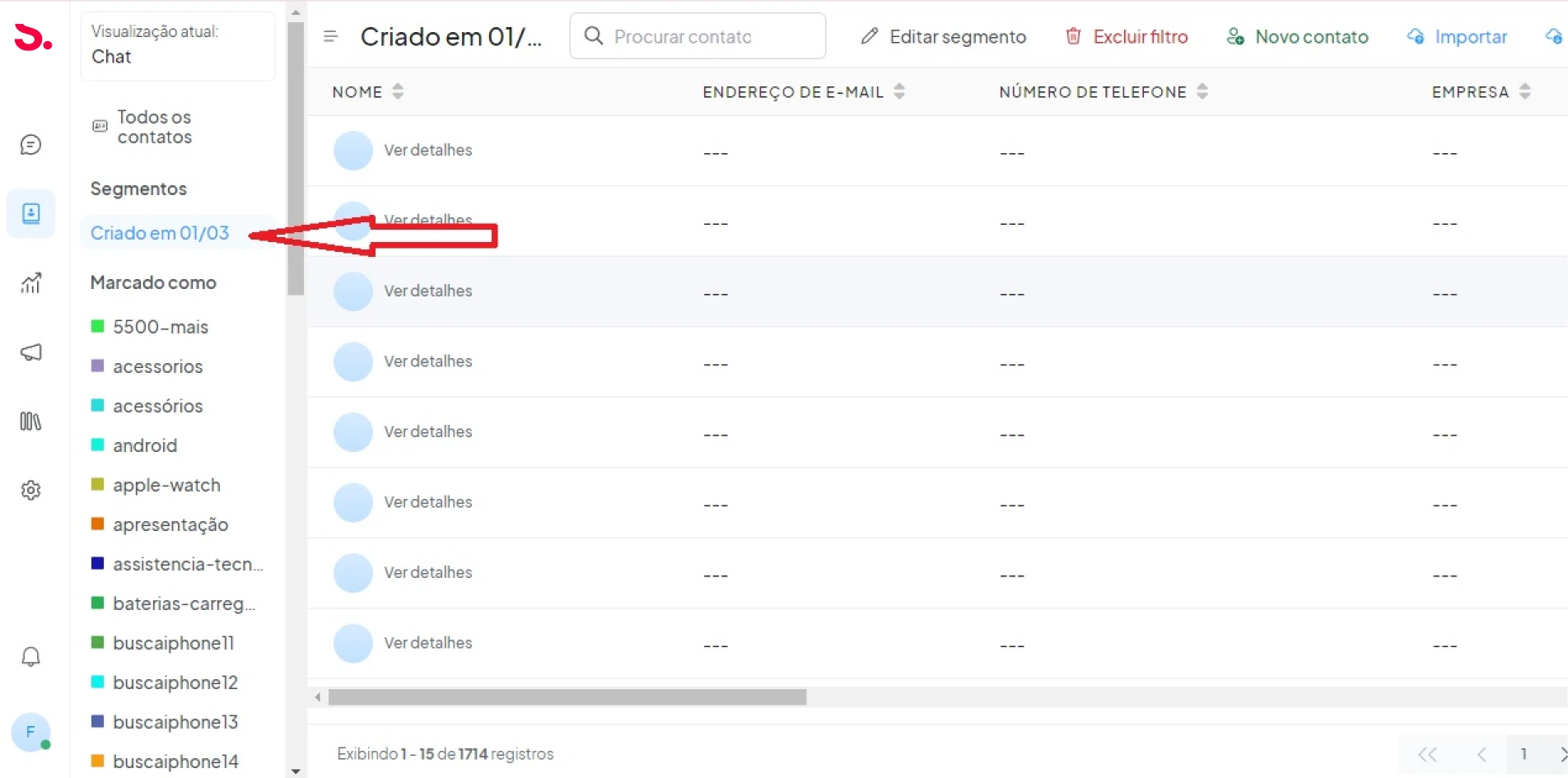 E agora o nome do segmento que você forneceu acima será exibido na barra lateral secundária como na imagem abaixo, ao clicar no segmento irá buscar todos os contatos que você salvou acima.![]()