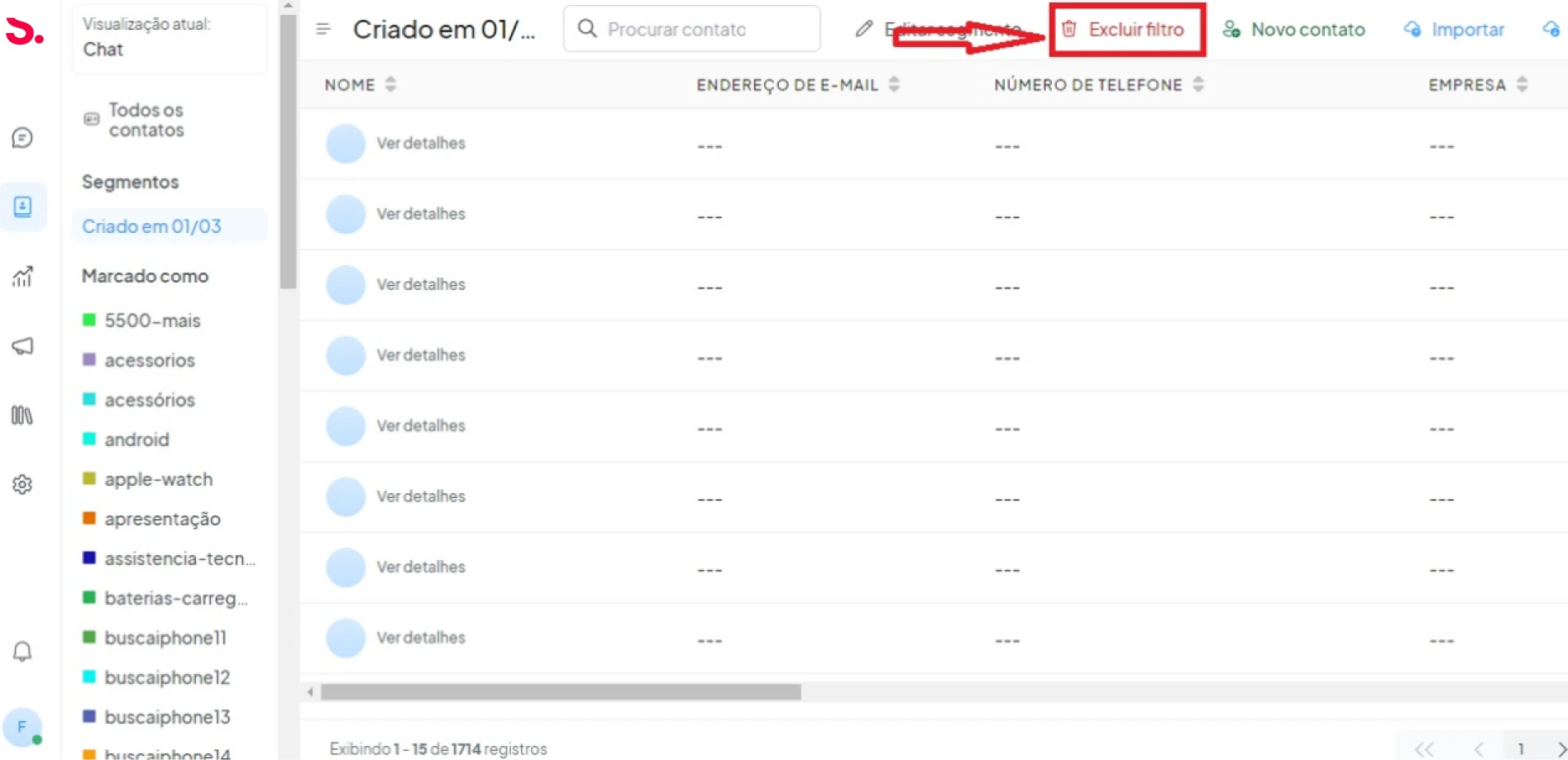 Se você deseja excluir o segmento salvo, você pode excluí-lo, clicando no botão excluir filtro no cabeçalho da página de contato para abrir um modal.´![]()