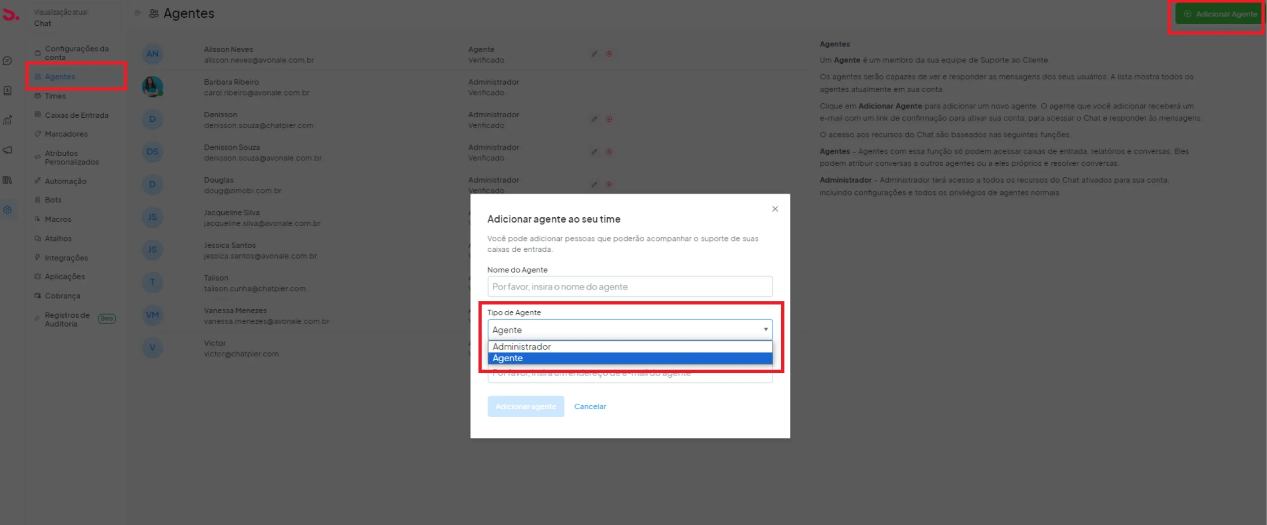 Passo 2: Agora selecione AGENTES > ADICIONAR AGENTE > NOME DO AGENTE > TIPO DO AGENTE (agente ou administrador) > INCLUA O ENDEREÇO DE E-MAIL