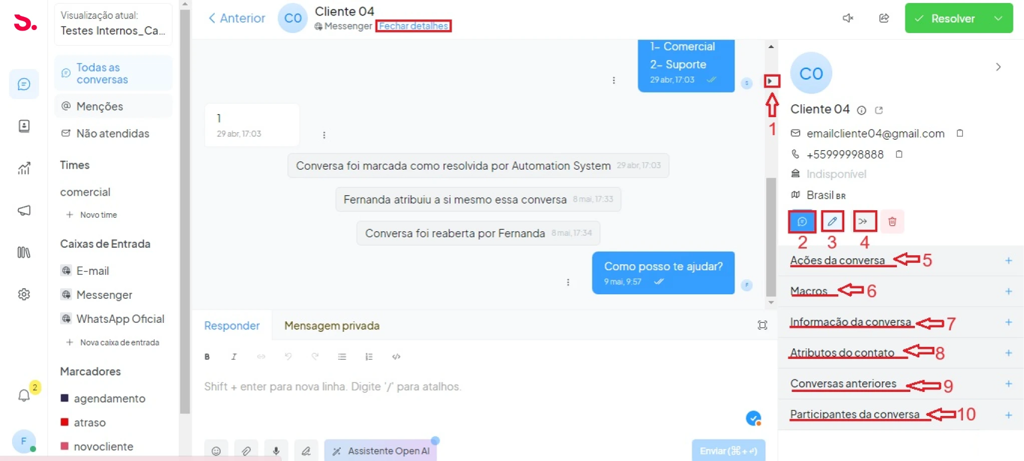 - 5- Adicione ou confira ações: atribua a conversa a um agente ou equipe, defina a prioridade ou adicione marcadores.