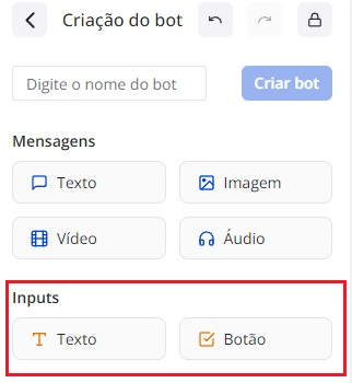 Passo 6: Para que o cliente possa responder ou selecionar uma opção, é necessário adicionar campos de entrada (inputs), que podem ser em formato de texto ou botões.